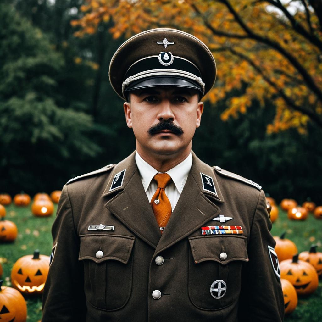 Hitler halloween outfit, photorealistic, adult man, Nazi-style uniform, brown military jacket, white shirt, brown tie, peaked cap with emblem, dark mustache, stern expression, autumn background, blurred people, orange jack-o'-lanterns, green foliage, overcast light, cinematic style, standing, centered, symmetrical, detailed ures, autumn colors, historical, dramatic lighting