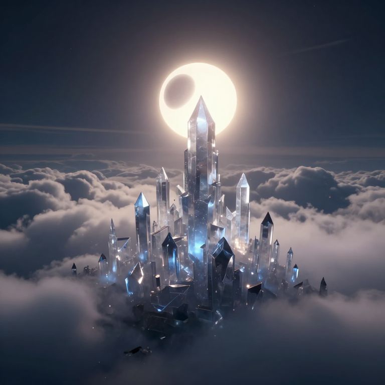 Emerging from the embrace of clouds, a crystalline metropolis bathed in the ethereal glow of an eclipse whispers secrets of transcendence, where light and shadow dance in harmony, evoking a profound sense of wonder and the timeless pursuit of enlightenment.