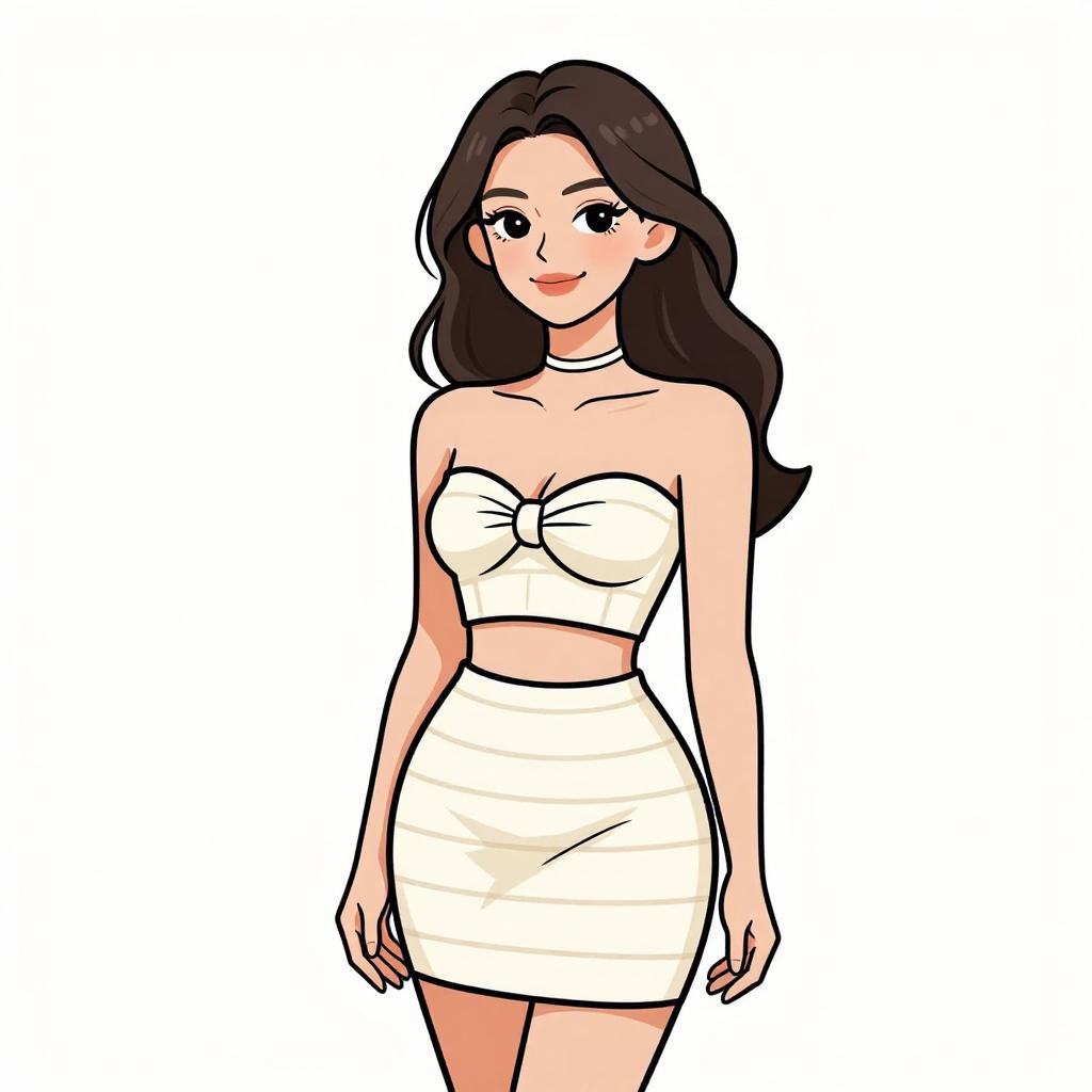 Woman with pretty face and pretty hair. smiling Woman, contemporary, strapless knot-front crop top in ivory with faint horizontal stripes, midriff-baring, matching high-waist mini skirt with form-fitting silhouette and similar striped pattern, minimalist choker necklace, wavy hair, plain white studio background. --sref 1467