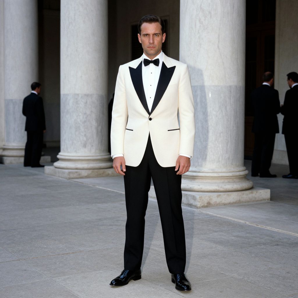 Photograph of a tall, handsome Caucasian man with short, dark brown hair standing in front of large, white marble columns. He is wearing a white tuxedo jacket with black lapels and a black bow tie, paired with black dress pants and shiny black dress shoes. His expression is serious, and he stands with his arms slightly relaxed at his sides. The background shows a stone-paved courtyard with a few other men in black suits standing in the distance, partially obscured by the columns. The lighting is natural, highlighting the textures of the marble and his formal attire.