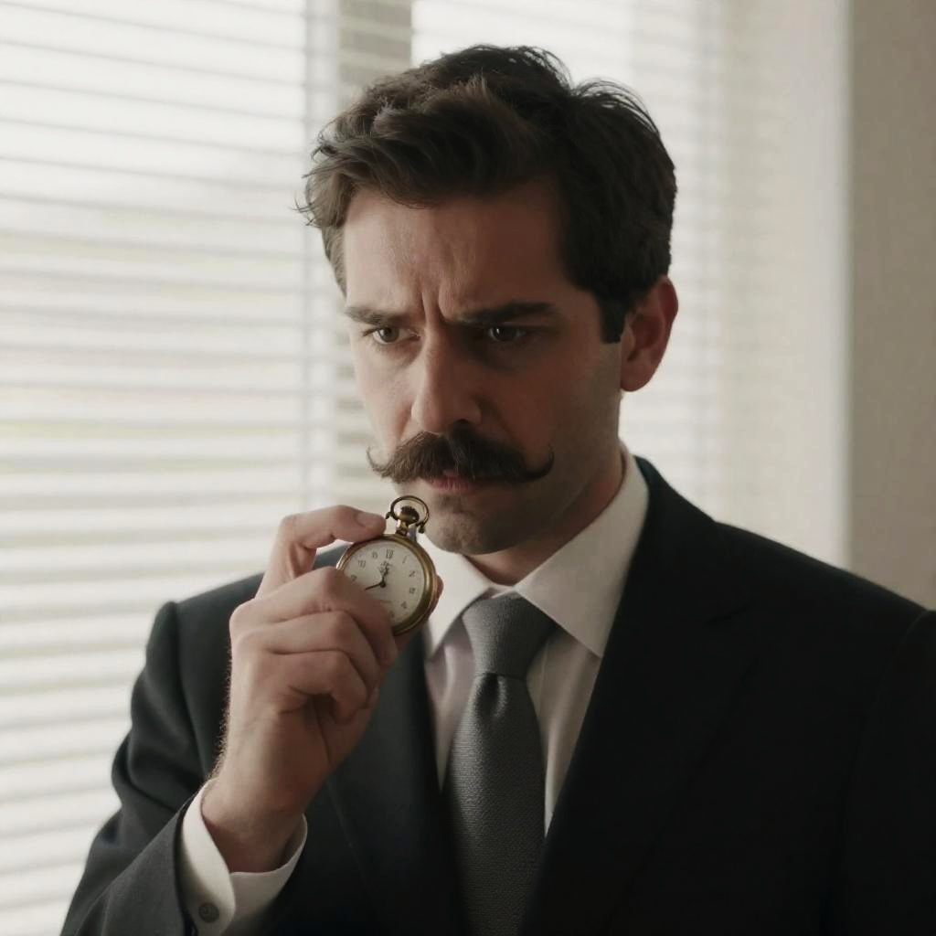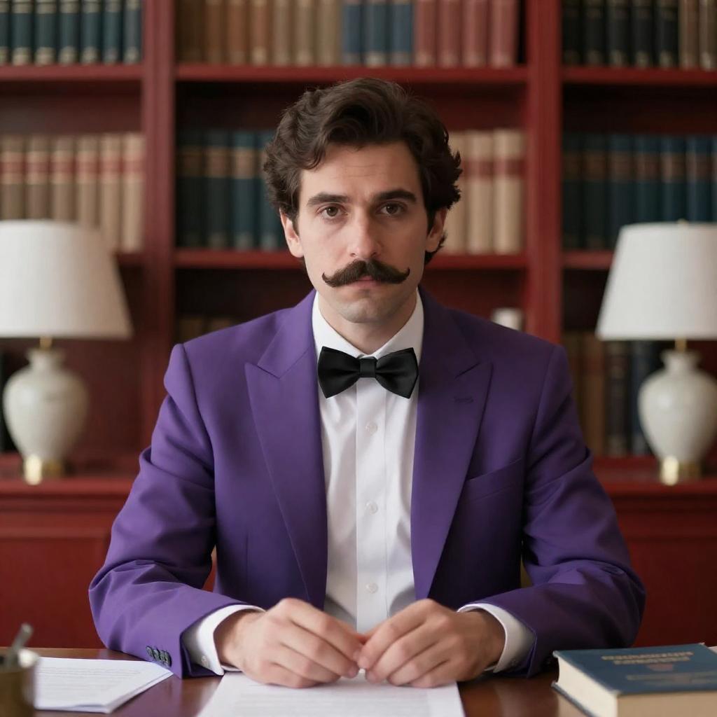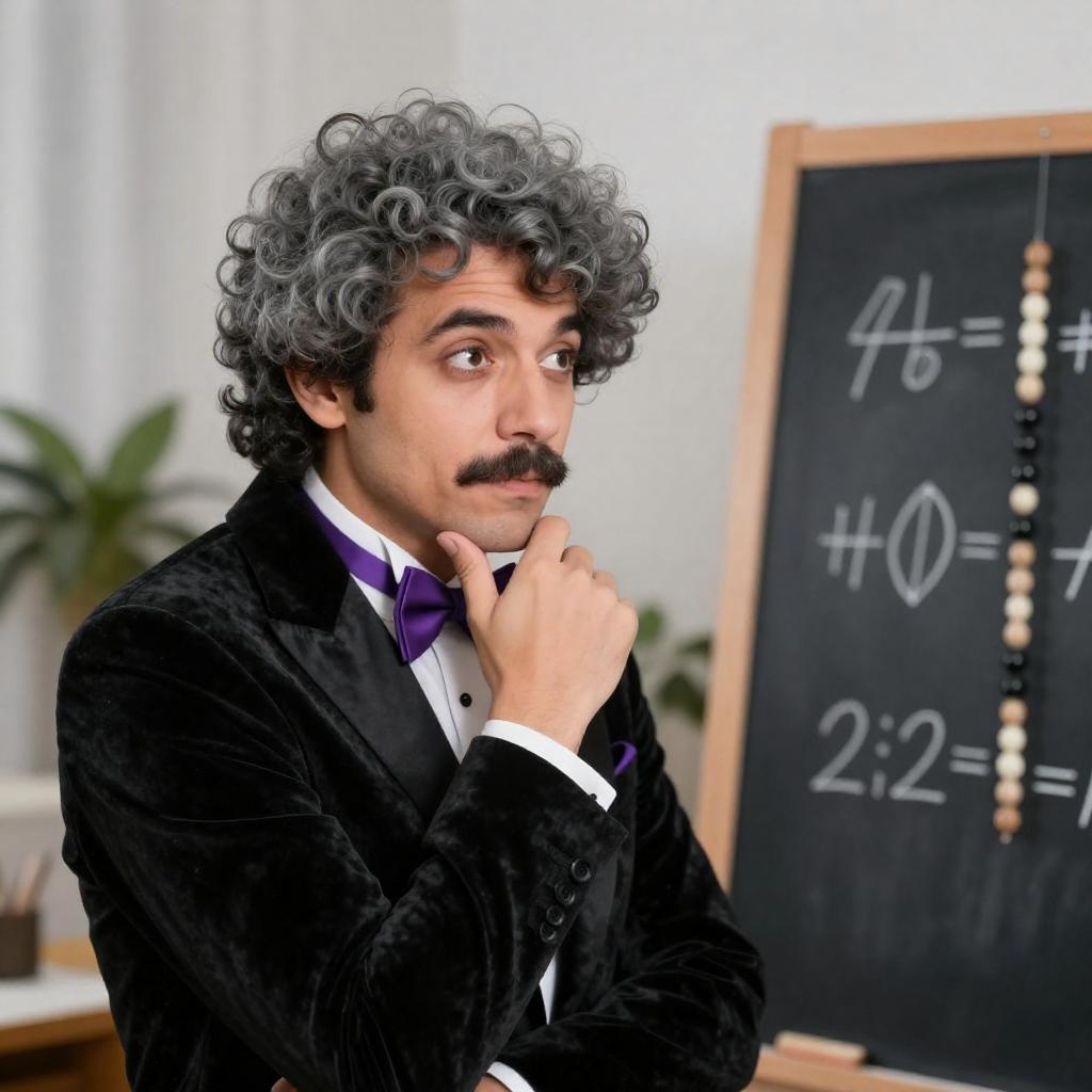 Photograph of a man with gray curly hair and a mustache, wearing a black velvet jacket and purple bow tie. He is holding his chin with his right hand, looking slightly to the side with a playful expression. A wooden chalkboard with a bead frame is on his right, showing a mathematical equation. Background includes white curtains and green plants.