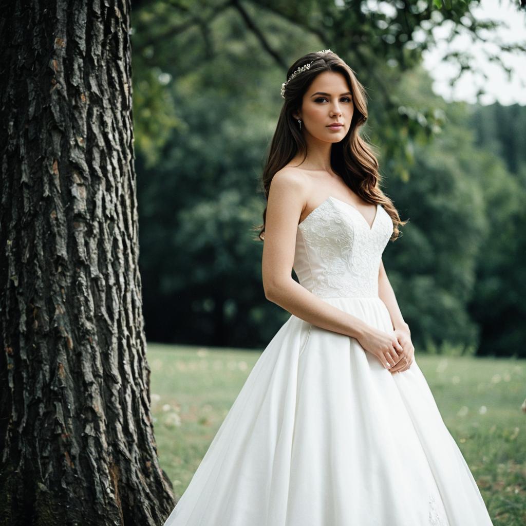 White wedding dress,1girl, solo, dress, brown hair, long hair, white dress, realistic, tree, outdoors, blurry background, blurry, photorealistic, wedding dress