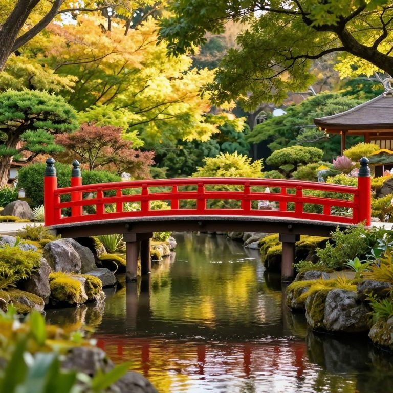 Photograph of a vibrant Japanese garden featuring a bright red, arched wooden bridge with black finials, spanning a reflective pond. The background is lush with autumn-colored trees in yellow, green, and red, surrounded by neatly trimmed shrubs and small rocks. To the right, a traditional wooden pavilion with a dark roof is partially visible. The bridge and pond are centered, with the vivid colors and natural textures creating a serene, picturesque setting. Soft sunlight filters through the trees, enhancing the warm, inviting atmosphere.