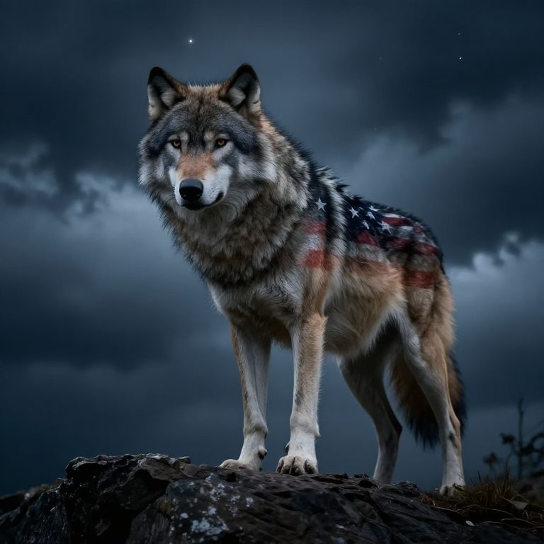 Wolf American flag, majestic wolf standing on a cliff under a stormy sky, its fur textured with the American flag patterns, intense gaze, a symbol of freedom and strength, cinematic atmosphere with glowing stars and deep shadows.