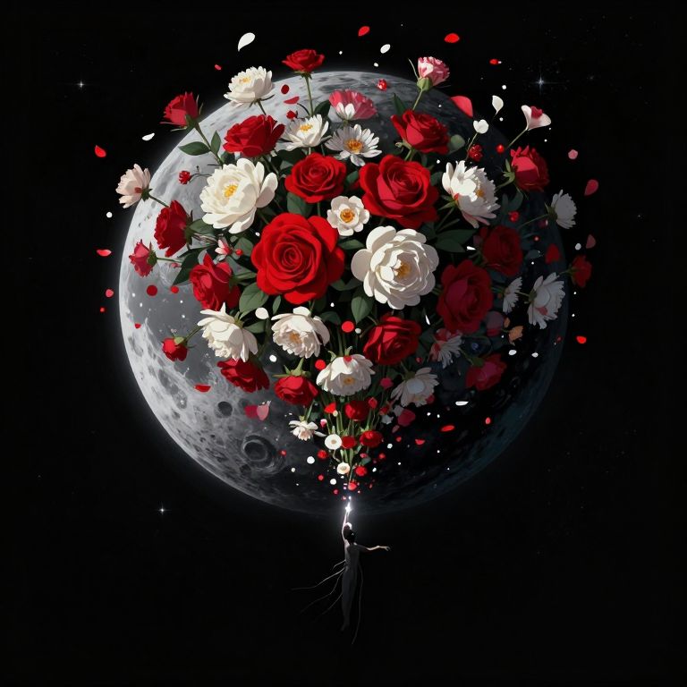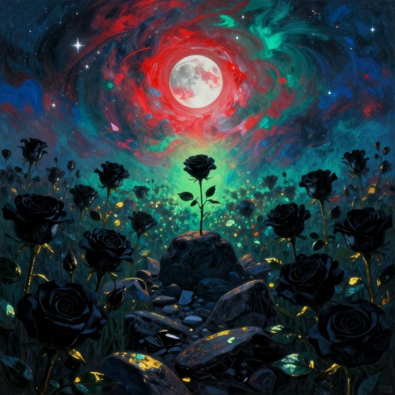 Vector art, detailed field, A field full of black roses during a novaburst with the sky lit up in red and teals, Stars and a nebula shining through, an air of melancholic reverie, ensconced amidst a phantasmagoric bloom of chromatic hues, A bleeding moon with an evil face Rendered in a style redolent of Impressionism, the painting utilizes a vibrant, high-key palette dominated by ethereal blacks and punctuated by strokes of chrome and gold, Position the subject on a rock, suspended amidst a riotous profusion of sharp rocks, The camera angle should be slightly low, lending an air of gentle ascension to the composition, The background should dissolve into an abstract symphony of cold blues suggestive of a radiant, moon-drenched night, The overall ambiance should evoke a sense of ephemeral beauty, tinged with a whisper of wistfulness, Symbolist chiaroscuro, tenebrist, volumetric lighting, subtle halation, high-contrast, film grain, lime green color grading, high dynamic range, S-curve gamma