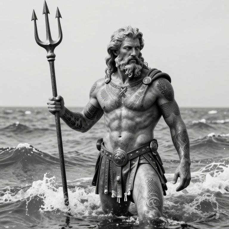 A hyper-detailed, Poseidon Greek holding a trident in a rough sea, standing out of the water with light and dark grey tones, featuring intricate shading and tattoo-like details, in a human-like style.