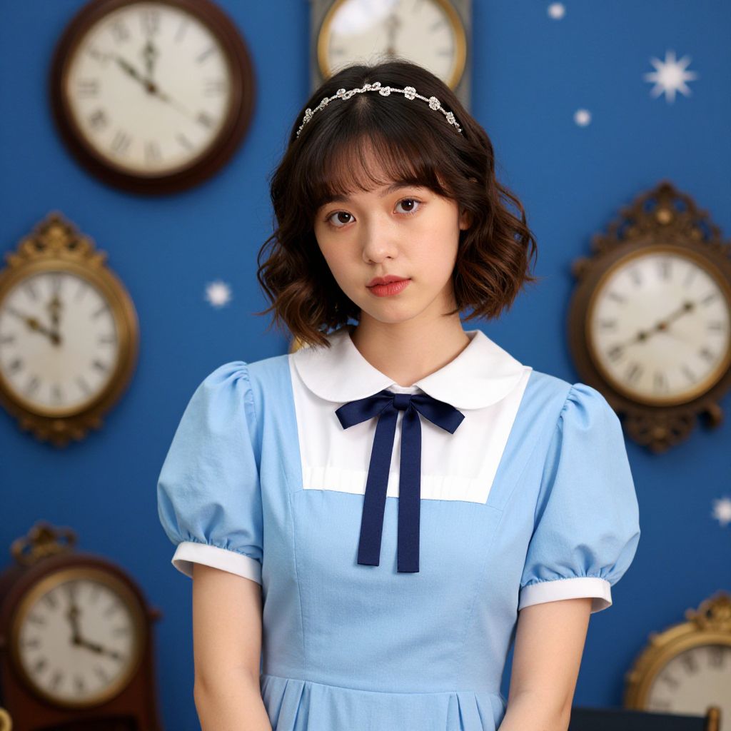 Photograph of an Asian girl with short black hair, wearing a light blue Alice in Wonderland dress with white collar and black ribbon, against a blue wall