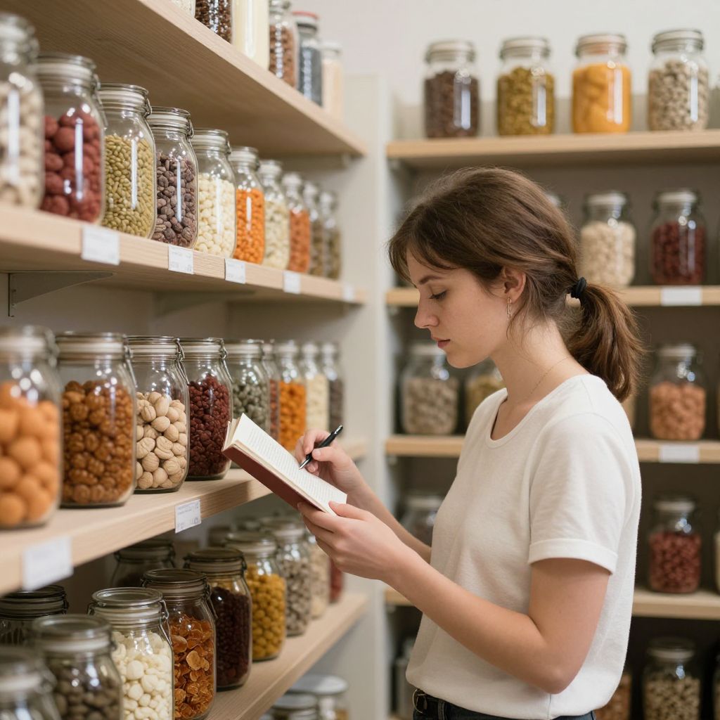 A photograph of a young woman with light skin and brown hair in a ponytail, wearing a white short-sleeved t-shirt, standing in a well-lit pantry. She is focused on a recipe book, holding it open with her right hand while her left hand points to the text. Shelves filled with various jars of dried beans, grains, and nuts surround her, displaying an array of colors including red, yellow, brown, and white. The shelves are made of light wood, and the jars have clear, glass lids. The background is slightly blurred, emphasizing the woman and the recipe book.