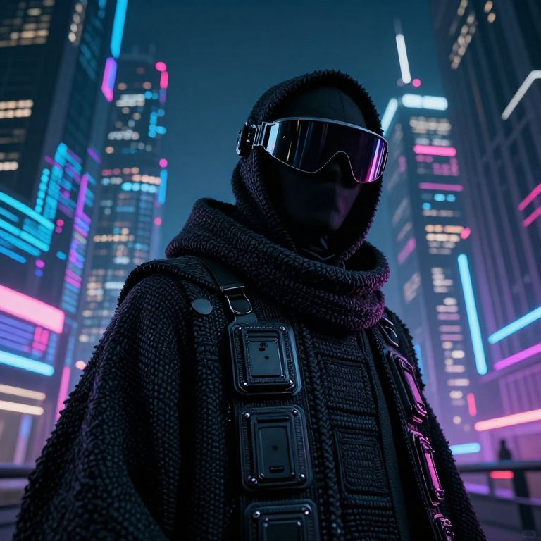 Imagine an ultrarealistic portrait of a shadowy figure, captured from a unique 'bug's-eye view' perspective. The subject, cloaked in intricate woven fabric with hidden compartments, dons a high-tech visor partially concealing their eyes. This enigmatic character exudes intrigue as they navigate a neon-lit futuristic cityscape filled with towering skyscrapers. In the background, dynamic holographic patterns shift across the urban landscape, seamlessly blending with the subject's advanced materials and technology, evoking both awe and unease.