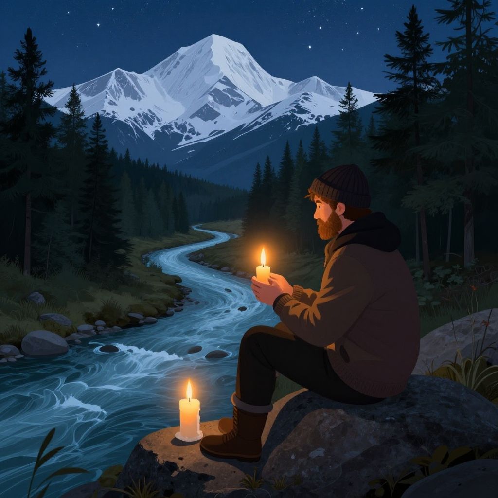 Illustration of a blond man dressed in a red outdoor outfit sitting on a rock by a campfire at night in a forest campsite. A red tent is visible in the background with another person adjusting tent poles. Tall pine trees and rocks surround the campsite under a dark blue night sky.