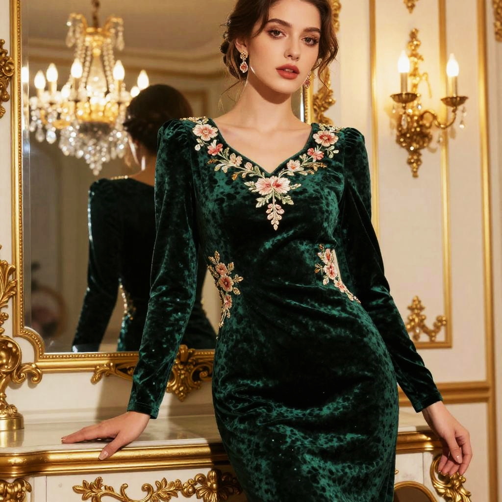 Sexy skin tight dress in deep emerald green velvet, delicately embroidered floral details, posed next to a grand ornate mirror in an opulent vintage room with crystal chandeliers, warm ambient light creating a glamorous and intimate mood.