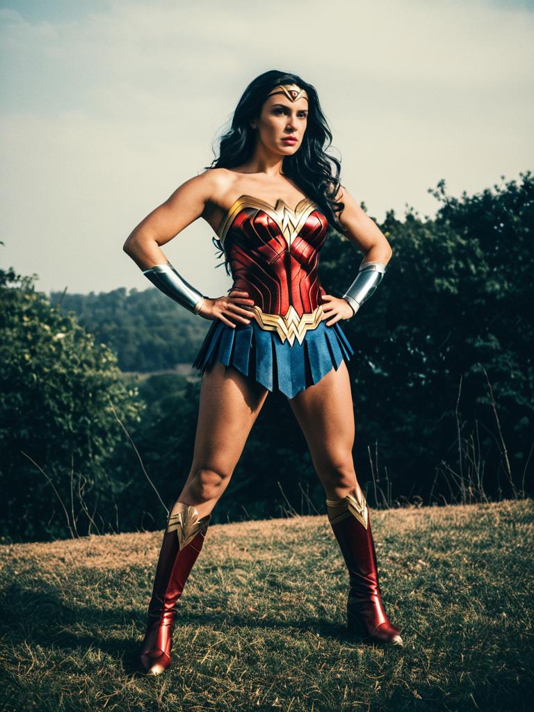 Woman in Wonder Woman costume, full-body outdoor cosplay photo in dramatic pose