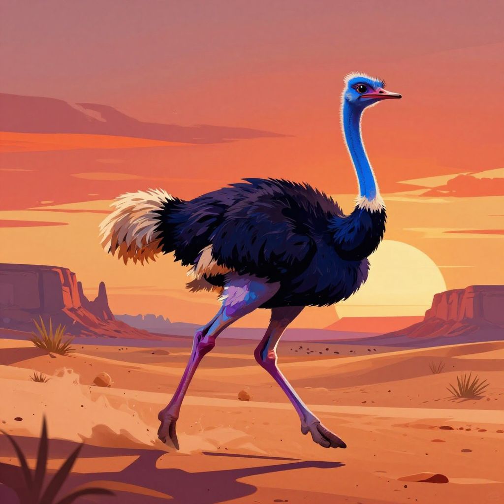 Vibrant digital illustration of a sleek ostrich running energetically across a desert landscape with a dramatic sunset background. The bird's feathers and legs are depicted in vivid blue and purple tones, contrasting against the warm oranges and reds of the desert and sky. The artwork captures the speed and intense energy of the ostrich in motion, set in an arid environment with distant mesas and desert vegetation.