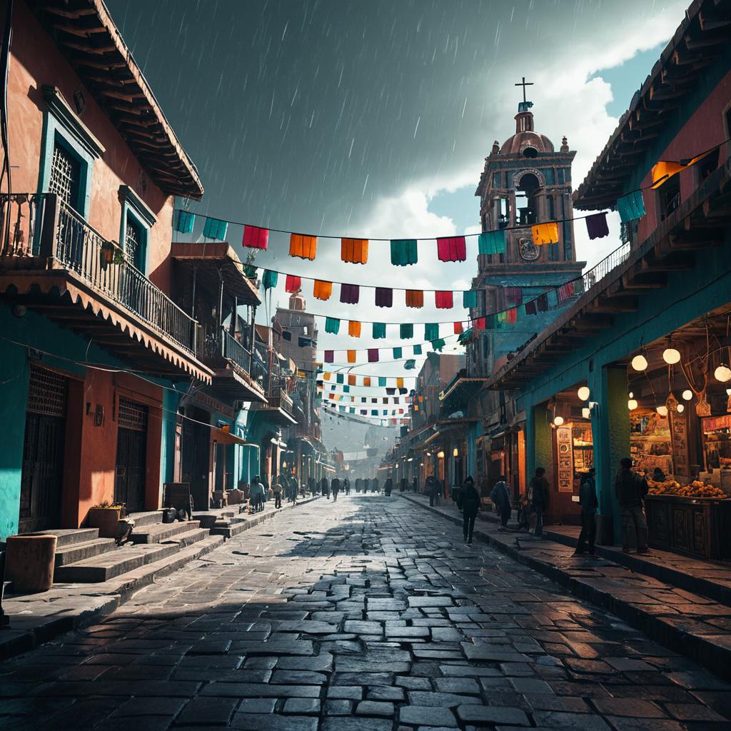 A rainy city street at dusk with glowing street lamps reflected on wet pavement, historic buildings lining the street, a tall gothic church steeple in the background, people walking under umbrellas, soft impressionist painting style with warm pastel tones, orange sunset sky blending with cool blue shadows, romantic and calm urban scene
