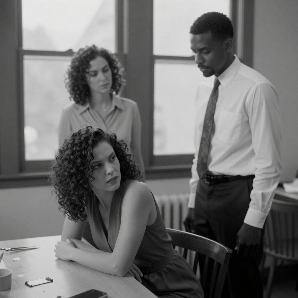 Black-and-white photograph of a woman with dark curly hair, wearing a long-sleeve, light-colored dress, sitting at a table. She is sorting through a stack of photographs with one hand. The table has a plate, a bowl, and a hat. A chair with an ornate backrest is behind her. A round table with a vase is in the background, with a window showing a blurry outdoor scene. The woman's expression is focused.