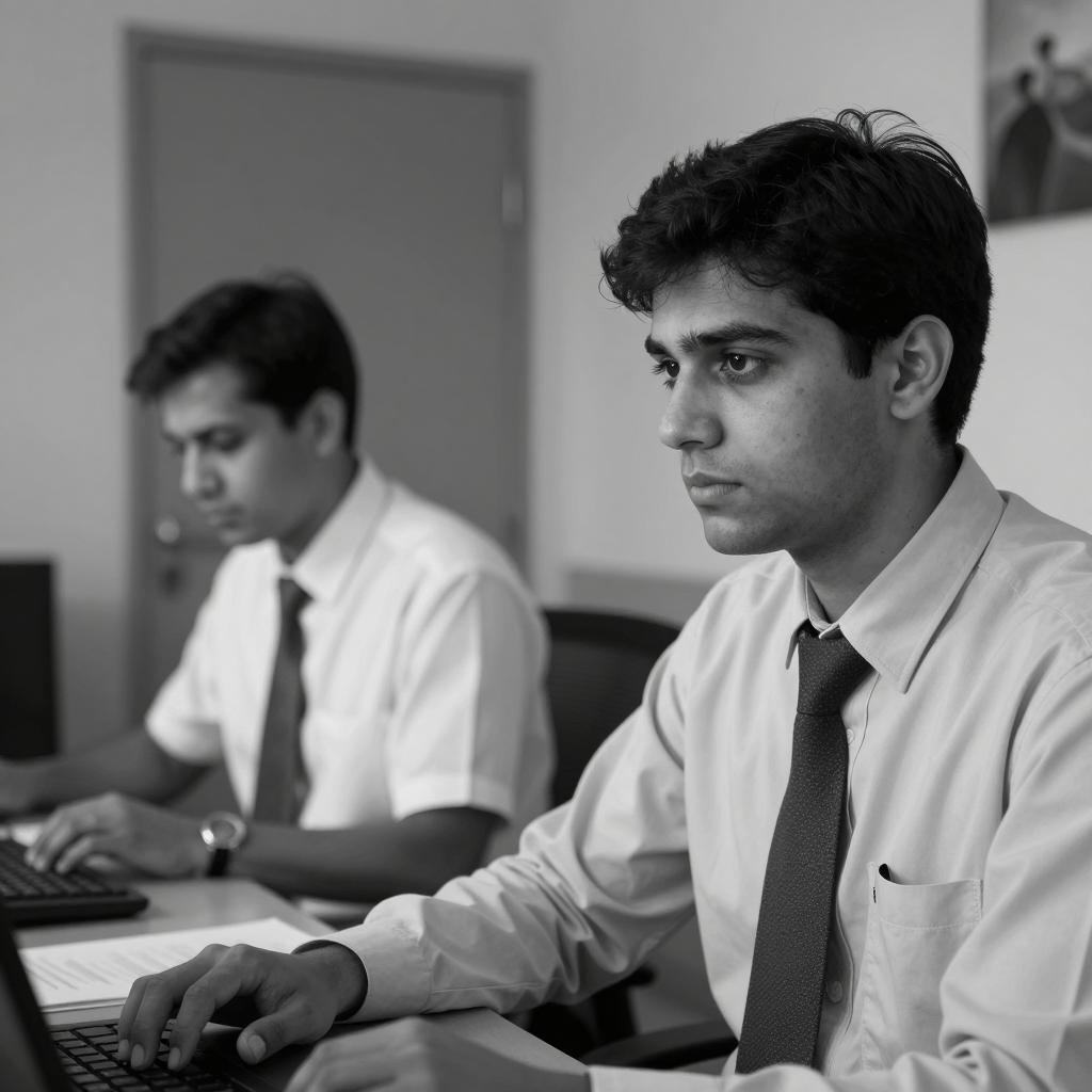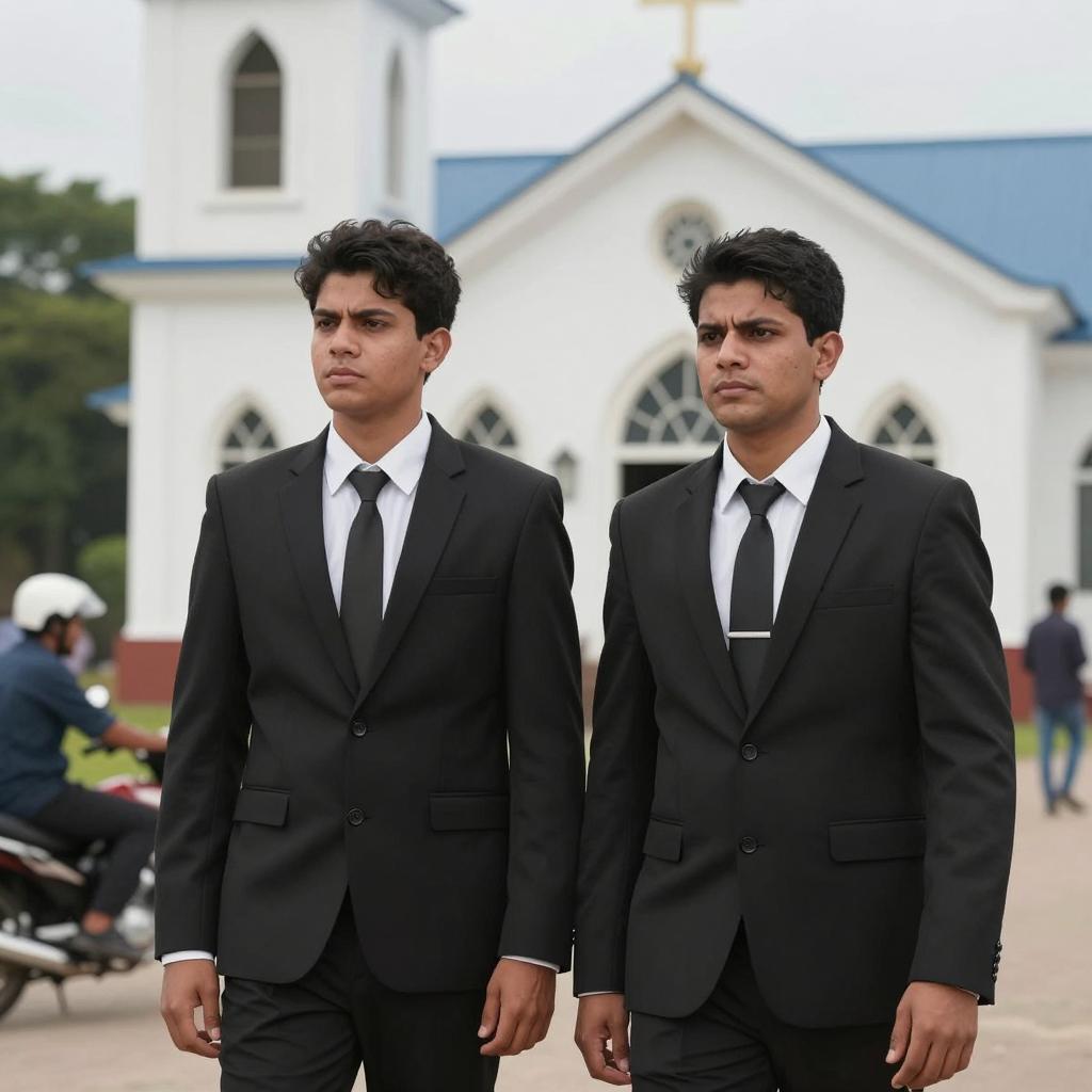 Photograph of two men in black suits with white shirts and ties, standing outdoors in front of a white church with a blue roof. The man on the left looks to the side, while the man on the right looks forward. Background includes a person sitting on a motorcycle, and other people in the distance. Both men have dark hair, the man on the right has a slightly stern expression. Grass and trees in the background.