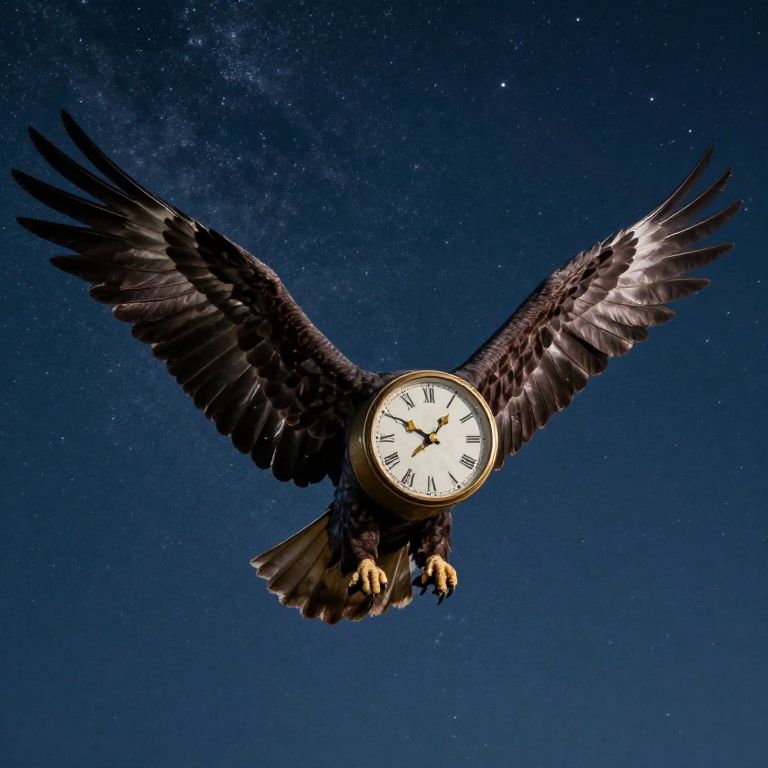 Eagle-like wings spread wide, a vintage clock with golden hands soars through a starry night sky, its feathers blending seamlessly with the celestial backdrop as it carries the timeless essence of flight and eternity.