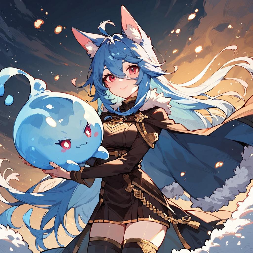 Score_9, score_8_up, score_7_up, score_6_up, tsepmet_urumir_xl, rimuru tempest, rating:safe, blue hair, cape, fur trim, long hair, yellow eyes, hair between eyes, fur-trimmed jacket, fur-trimmed legwear, blue fur trimmed jacket, holding slime \(creature\), cute, = =. + +, official wallpaper, on a snowy mountain, backlighting, cowboy shot