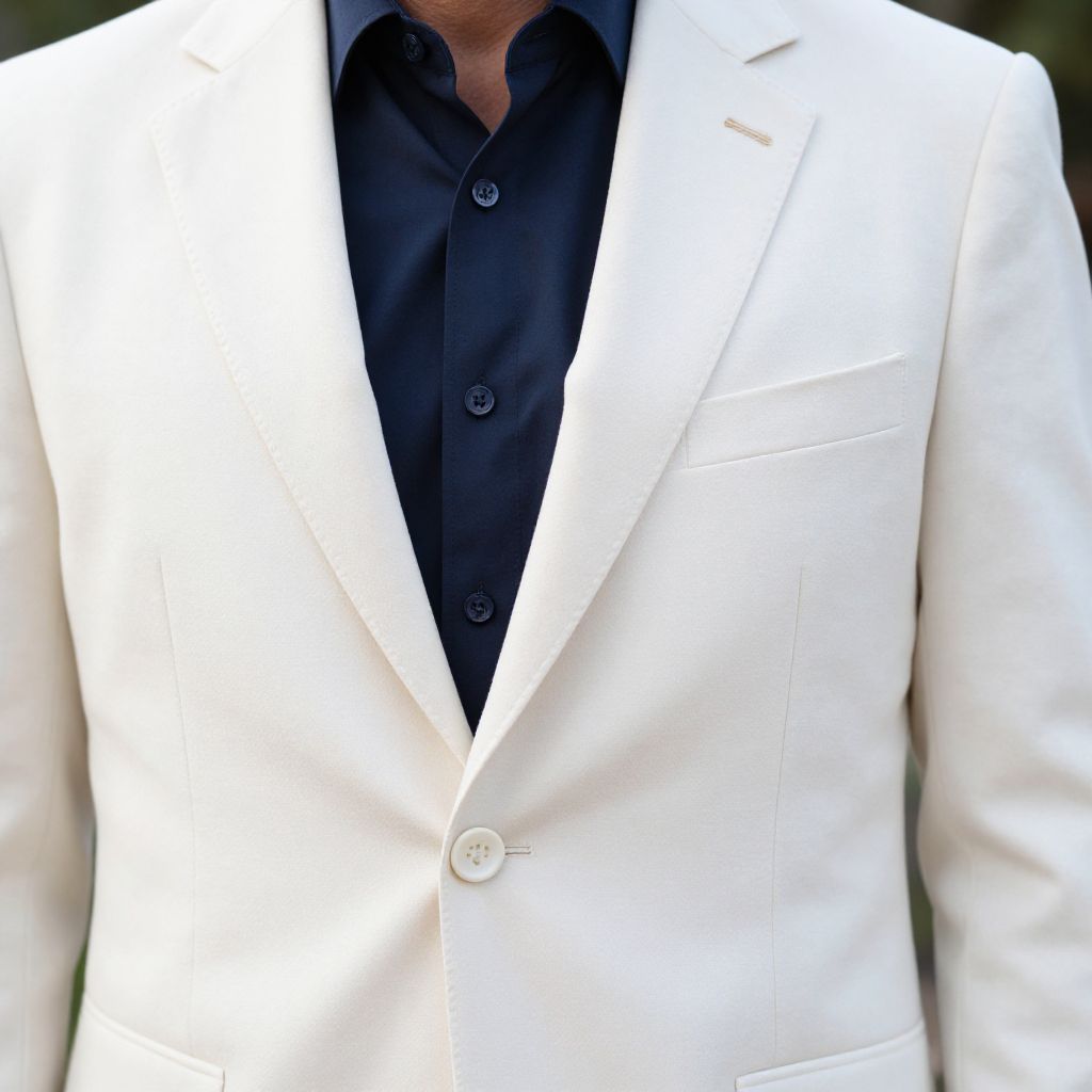 Close-up view of a man wearing a crisp white two-button wool suit jacket over a navy blue button-down shirt, showcasing a polished and stylish ensemble.