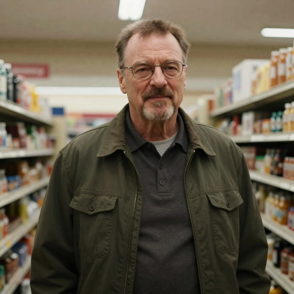 A mature Caucasian man with glasses and a beard, wearing a dark olive green jacket over a grey polo shirt, standing in a grocery store aisle. The setting is indoors with shelves stocked with various products on both sides, captured in a candid and natural style.