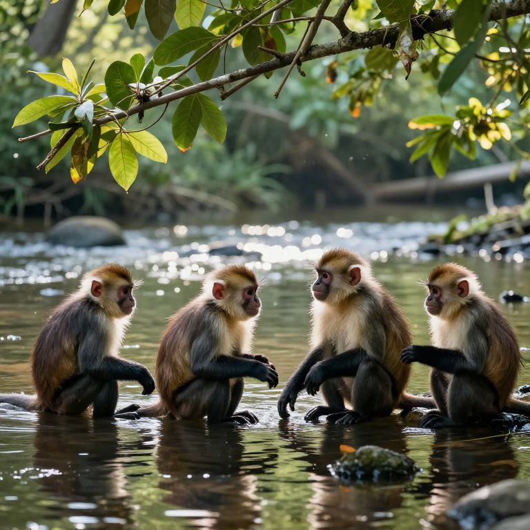 A group of playful macacos gathering near a sparkling jungle river, reflections on water, detailed leaves and branches, soft morning light, conveying lively social interaction, rich natural colors, serene and vivid wildlife composition