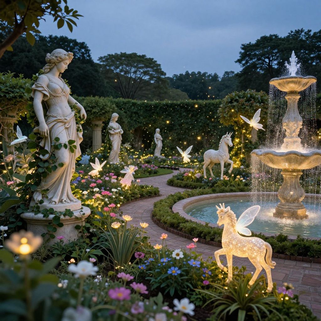 Evermore enchanted garden at twilight, filled with luminescent flowers and sparkling fountains, elegant marble statues covered in ivy, fireflies dancing in the air, delicate fantasy creatures like fairies and unicorns wandering, soft glowing lights and magical ambiance, ultra-realistic style