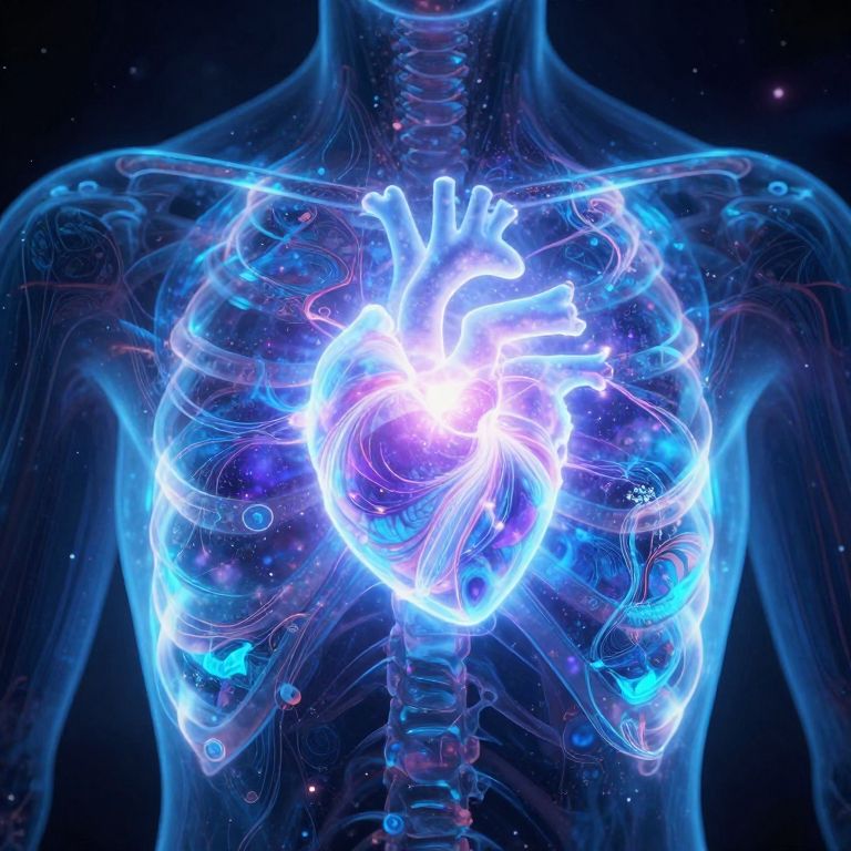 Pecho, surreal artwork of a glowing chest with abstract patterns and cosmic elements, vibrant blues and purples, ethereal light radiating from the heart area, fantasy style, mystical aura, rich texture and depth