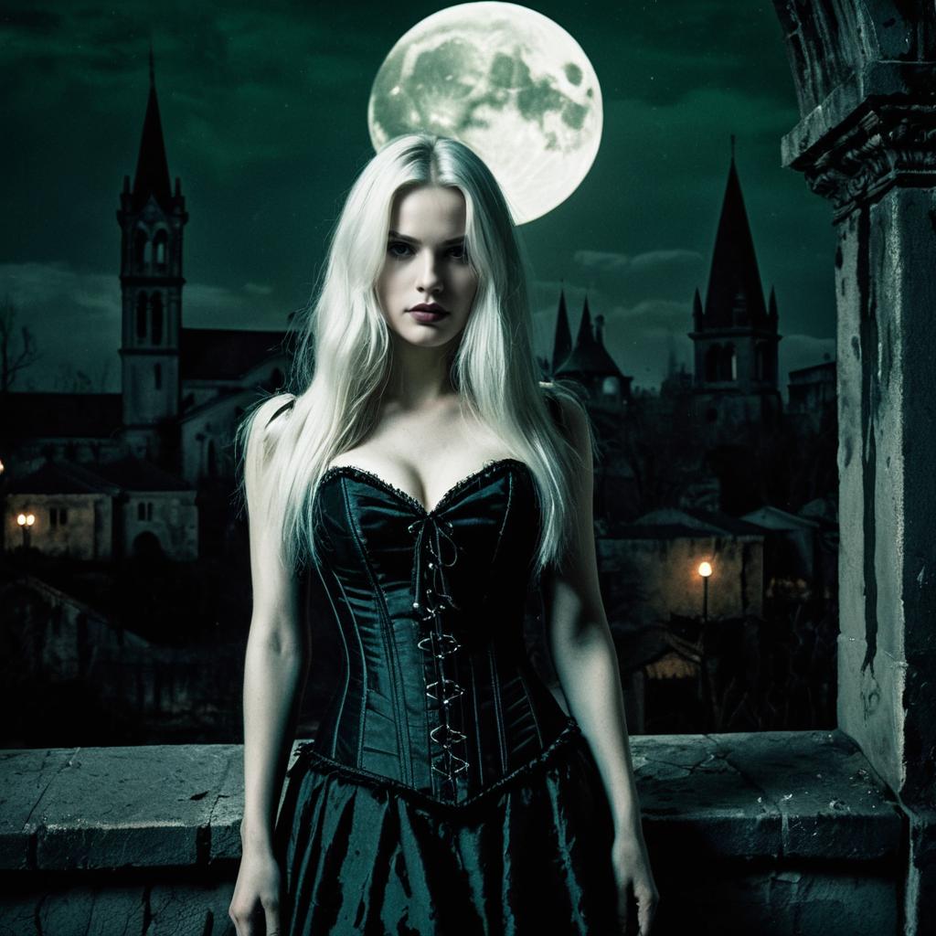 A gothic woman with white messy hair and red lips wearing a tight black corset dress standing against an old brick wall at night, a full bright moon in the dark cloudy sky, distant gothic cityscape with pointed rooftops, dramatic high contrast lighting, moody cinematic noir atmosphere