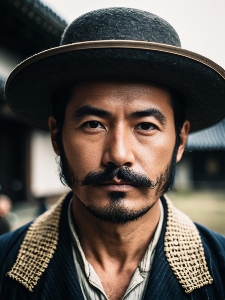 Man full outfit costume,1boy,male focus,solo,hat,facial hair,standing,full body,beard,long sleeves,looking at viewer,door,closed mouth,mustache,outdoors,korean clothes,pants