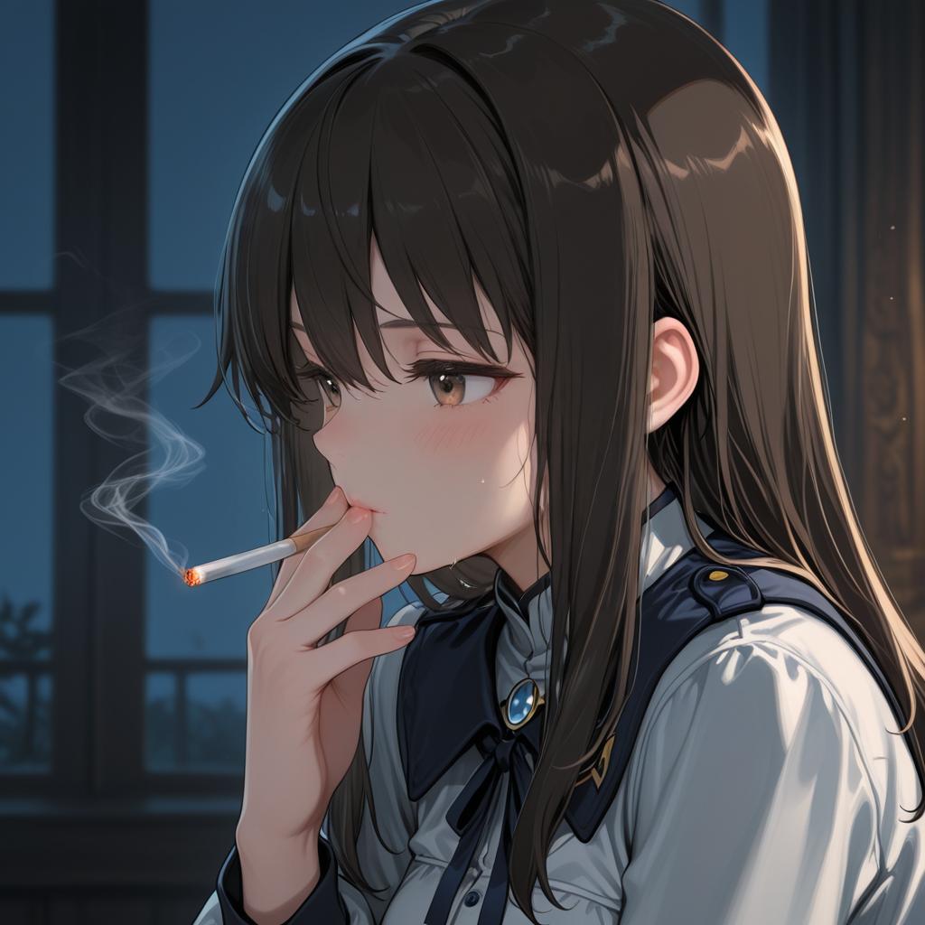 Elizabeth f. beurling, world witches series, 1girl, blue eyes, long hair, brown hair, black hair, cigarette, by artist djheycha, dark_illustrious