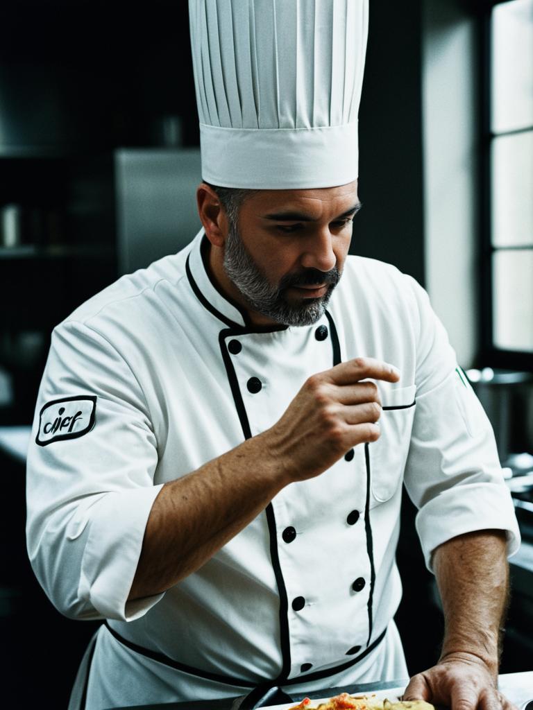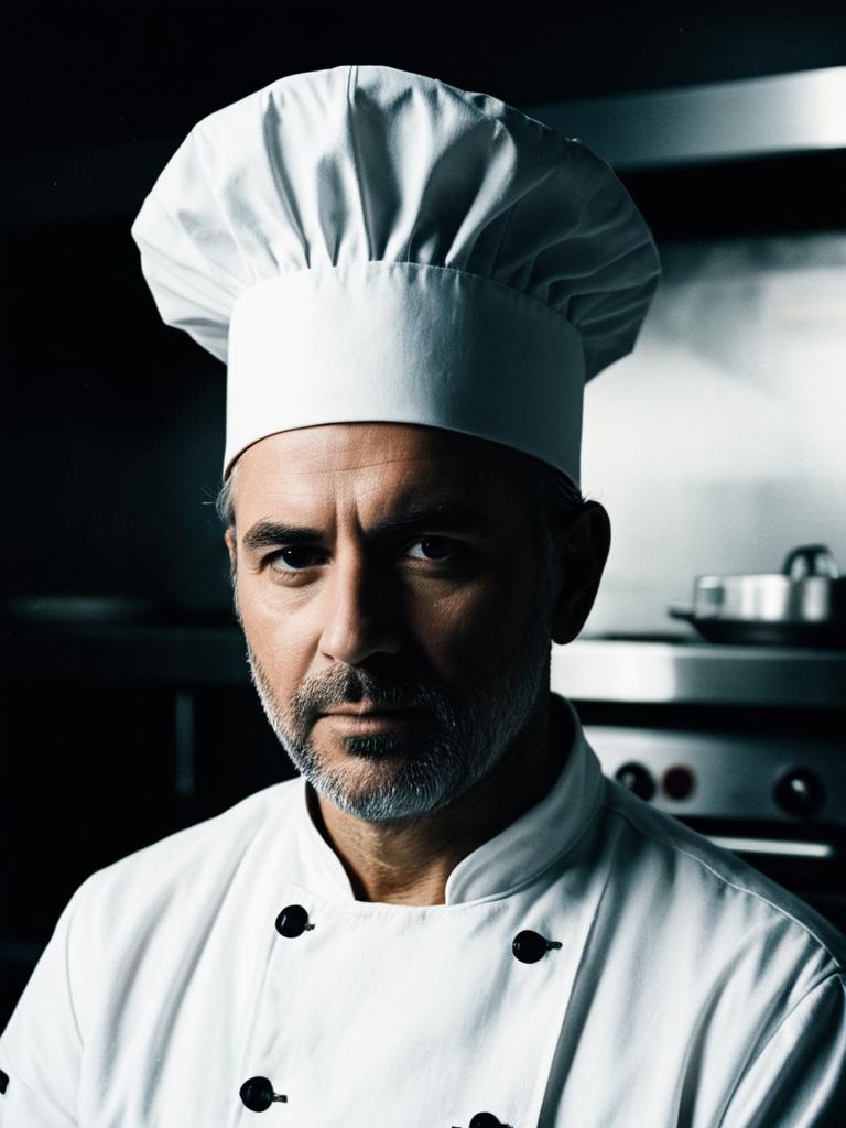 Close-up dramatic portrait of a middle-aged male chef wearing a traditional white chef coat with black buttons and a white chef hat, set against a dark background. The chef features a trimmed beard and mustache, with a serious and thoughtful expression, highlighting the cinematic realism and editorial style.