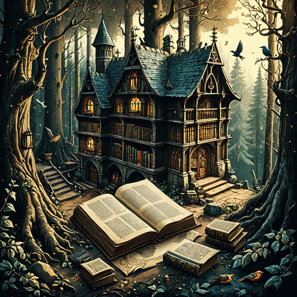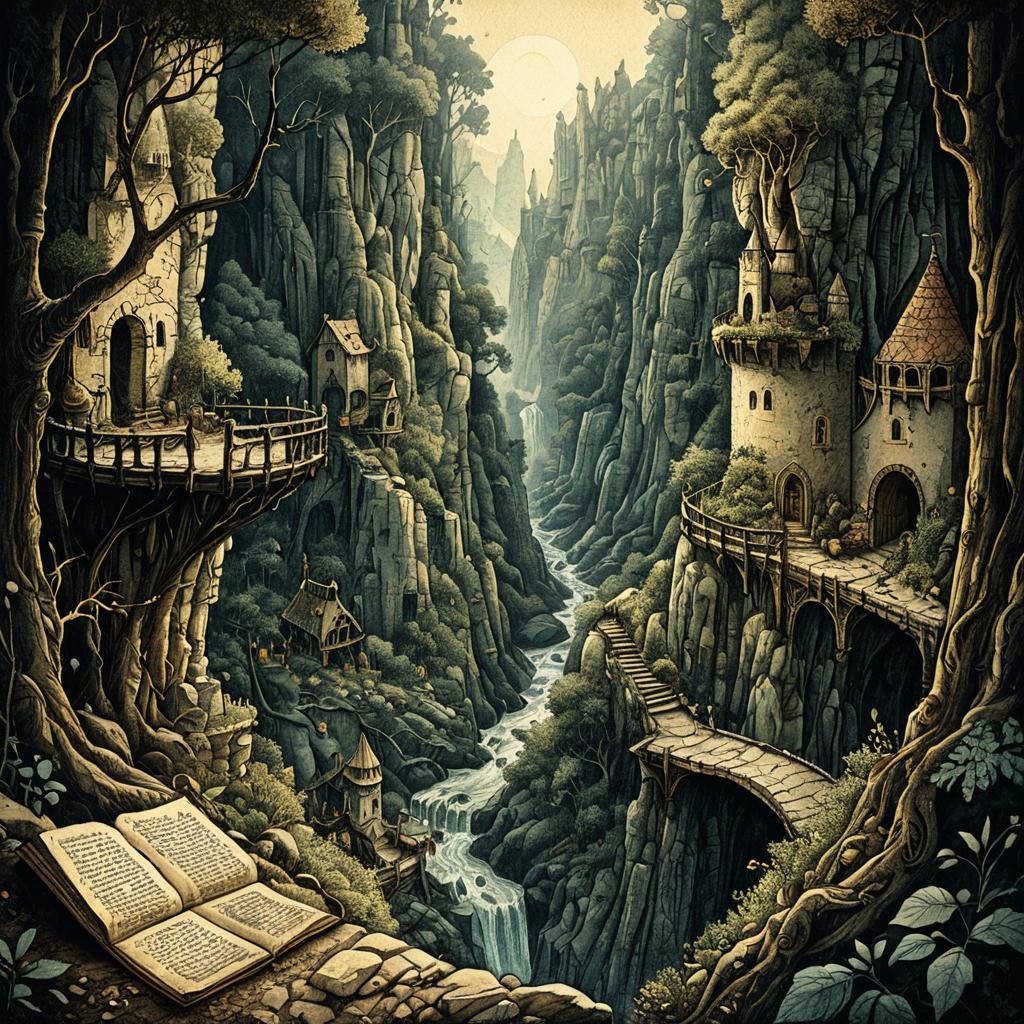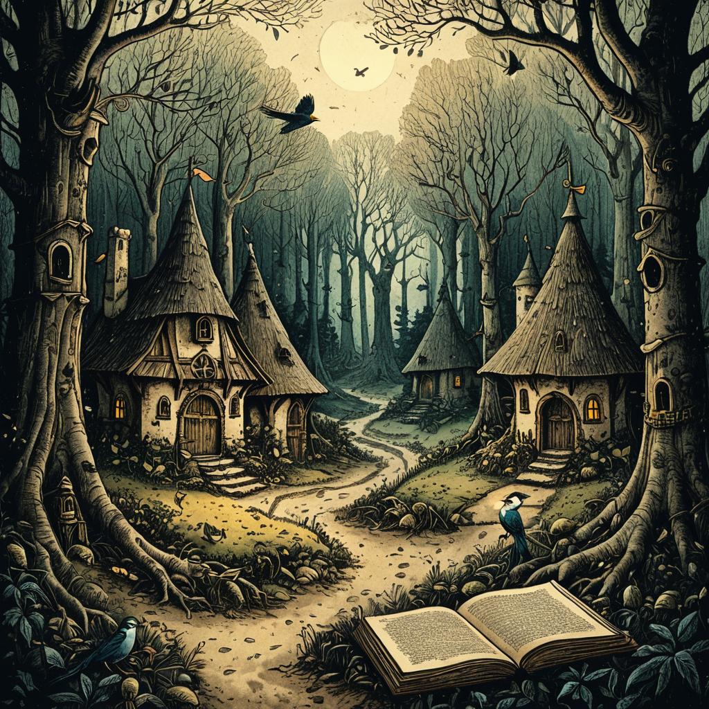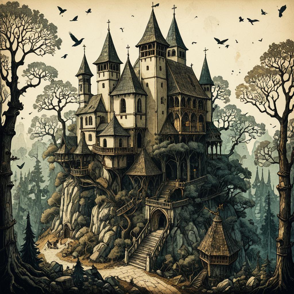 Anton Pieck style illustration of a medieval fantasy hidden alcove in the trees, bird's eye view, in the forest, vintage paper texture, intricate line work, high detail, mystical atmosphere, warm and nostalgic tones, soft lighting, high quality, magical artifacts, nostalgic, warm tones, soft lighting