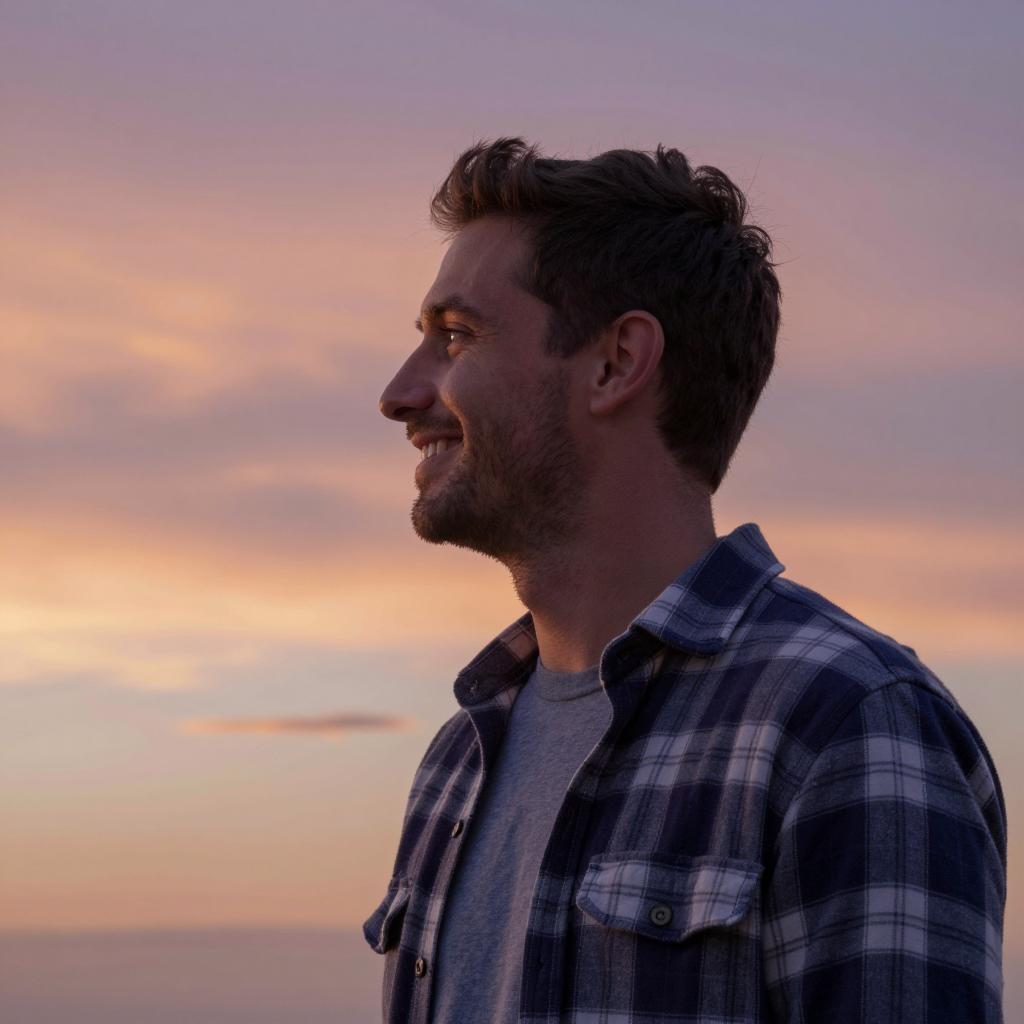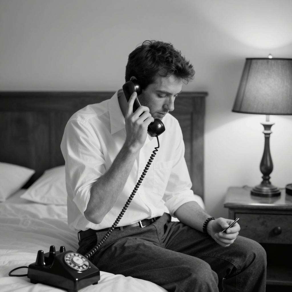 Black and white photograph. Man with short, dark hair, wearing a ribbed, dark sweater, stands facing left, pulling back a sheer curtain with his right hand. Floral curtain on the right, white wall behind. Light filters through curtain.