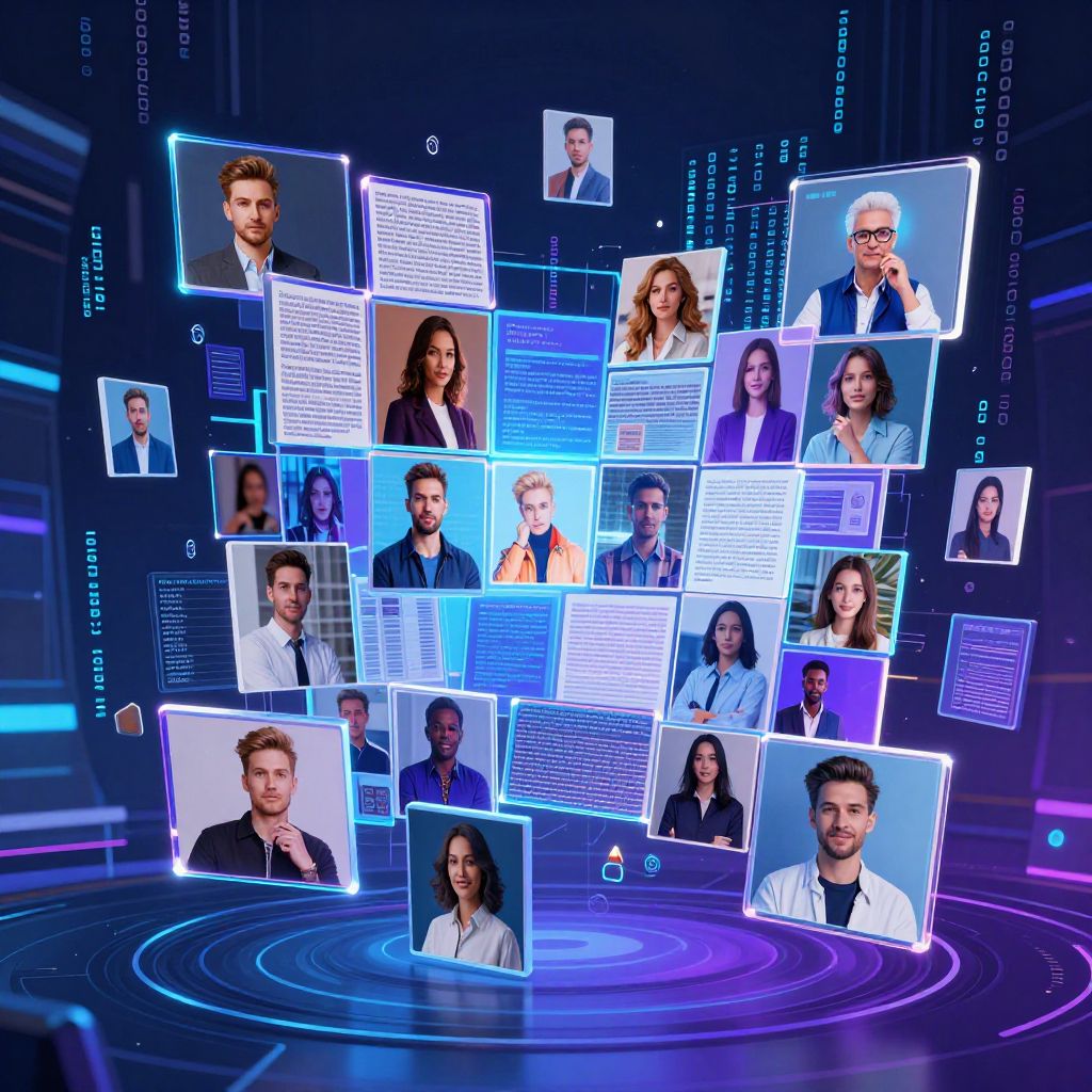 Stylized concept art of an AI photo editor online free application as a dynamic glowing hologram in mid-air, surrounded by floating photo thumbnails, abstract neon light trails and futuristic background, emphasizing cutting-edge technology and creativity