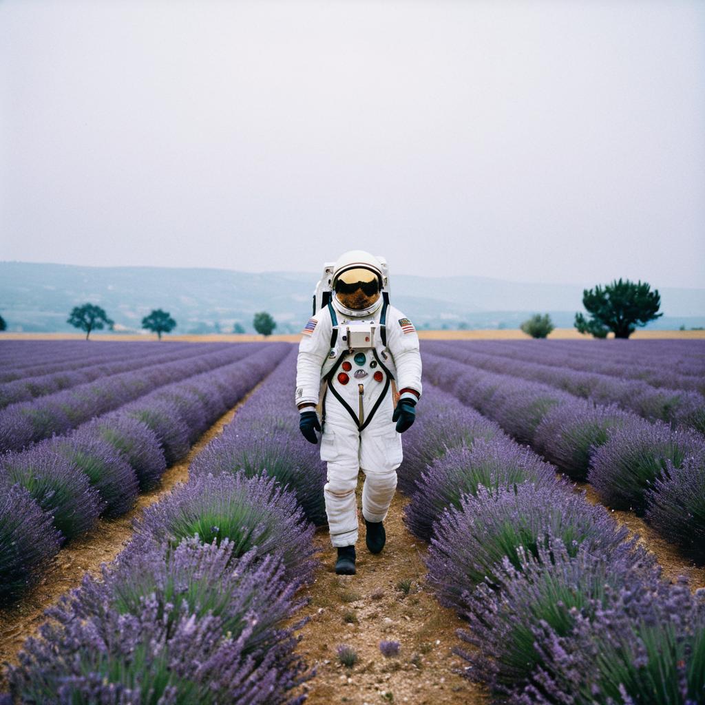 An astronaut in a white space suit walking between rows of blooming lavender plants in a vast field located in Provence, France. The scene shows soft morning mist and a dreamlike tranquility with distant trees and hills under a pale sky.