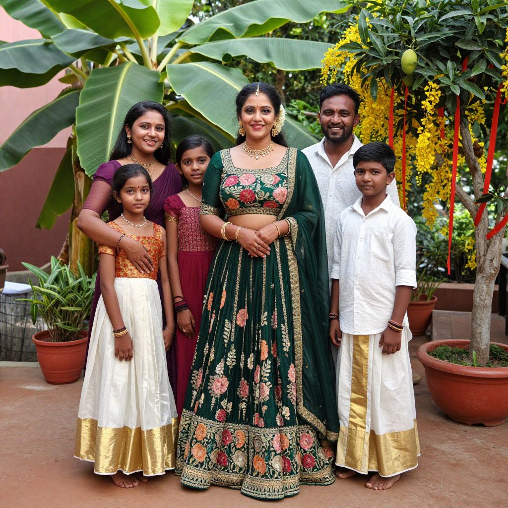 A group photo of a family in South India celebrating Vishu, with a woman wearing a full Vishu special dress costume featuring floral patterns, deep green and gold accents, her face adorned with natural makeup and a traditional smile, standing in a courtyard filled with banana trees, potted plants, and a decorated mango tree with red ribbons.. The woman has big breasts and cute face