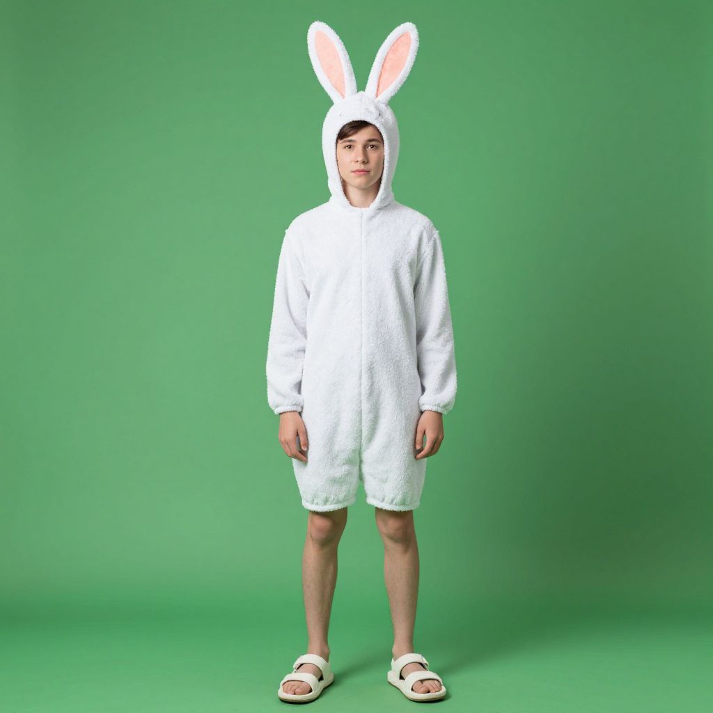 Green eggs ham costume, solo, male focus, 1boy, green background, rabbit costume, realistic, standing, cosplay, sandals, animal costume, full body, parody, what