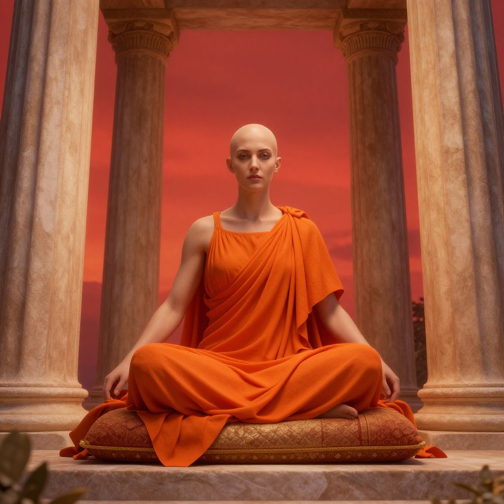 Photograph-style CGI of a bald, fair-skinned woman with a serene expression, sitting cross-legged on an ornate cushion in a classical temple setting. She wears a vibrant orange, draped robe, contrasting with the warm, reddish-orange sky and ancient stone columns behind her. Her hands rest on her knees in a meditative pose. The columns are weathered, adding texture to the scene, and the cushion is richly detailed with gold embroidery. The overall composition evokes a sense of tranquility and ancient wisdom.
