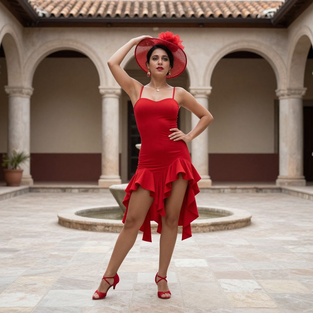 Photograph of a confident woman standing in a courtyard with arched columns. She wears a vibrant red, sleeveless, asymmetrical dress with a ruffled hem, and matching red high-heeled sandals. She dons a wide-brimmed red hat adorned with a red feather. Her dark hair is styled neatly, and she has red lipstick, complementing her outfit. Her right hand is on her hip, and her left hand holds her hat. The background features a tiled roof and a circular stone fountain. The courtyard has a tiled floor and is illuminated with natural light.
