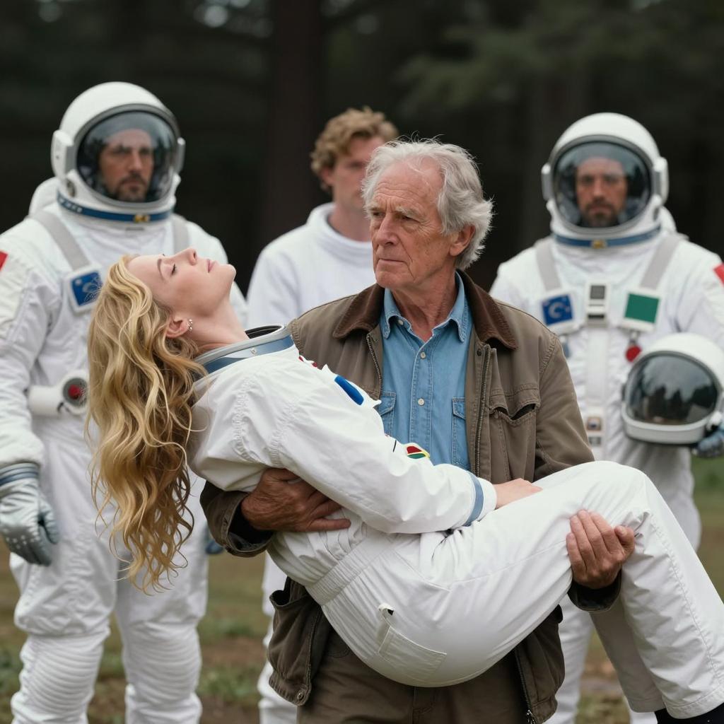 Old man with gray hair, blue shirt, and brown jacket carries blonde woman with her head back, eyes closed. Three people in white space suits stand in background. One man in white suit holds helmet. Outdoor setting with dark trees. Woman's wavy hair, man's serious expression.