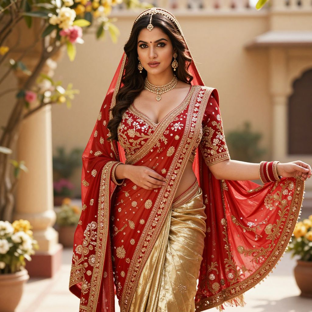 A stunning sexy woman with big tits and a captivating gaze is wearing a traditional red and gold saree with intricate red, gold, and white embroidery, paired with a matching dupatta that flows elegantly around her. The saree is richly adorned with detailed handwork, and she wears a delicate necklace and sparkling earrings on her neck. She has a luxurious headband securing her hair, giving her a regal and elegant look. The setting is a sunlit traditional Indian courtyard with blooming flowers and soft golden light, enhancing her beauty and aura. The image captures her grace, confidence, and sensuality in a culturally rich and visually stunning way.