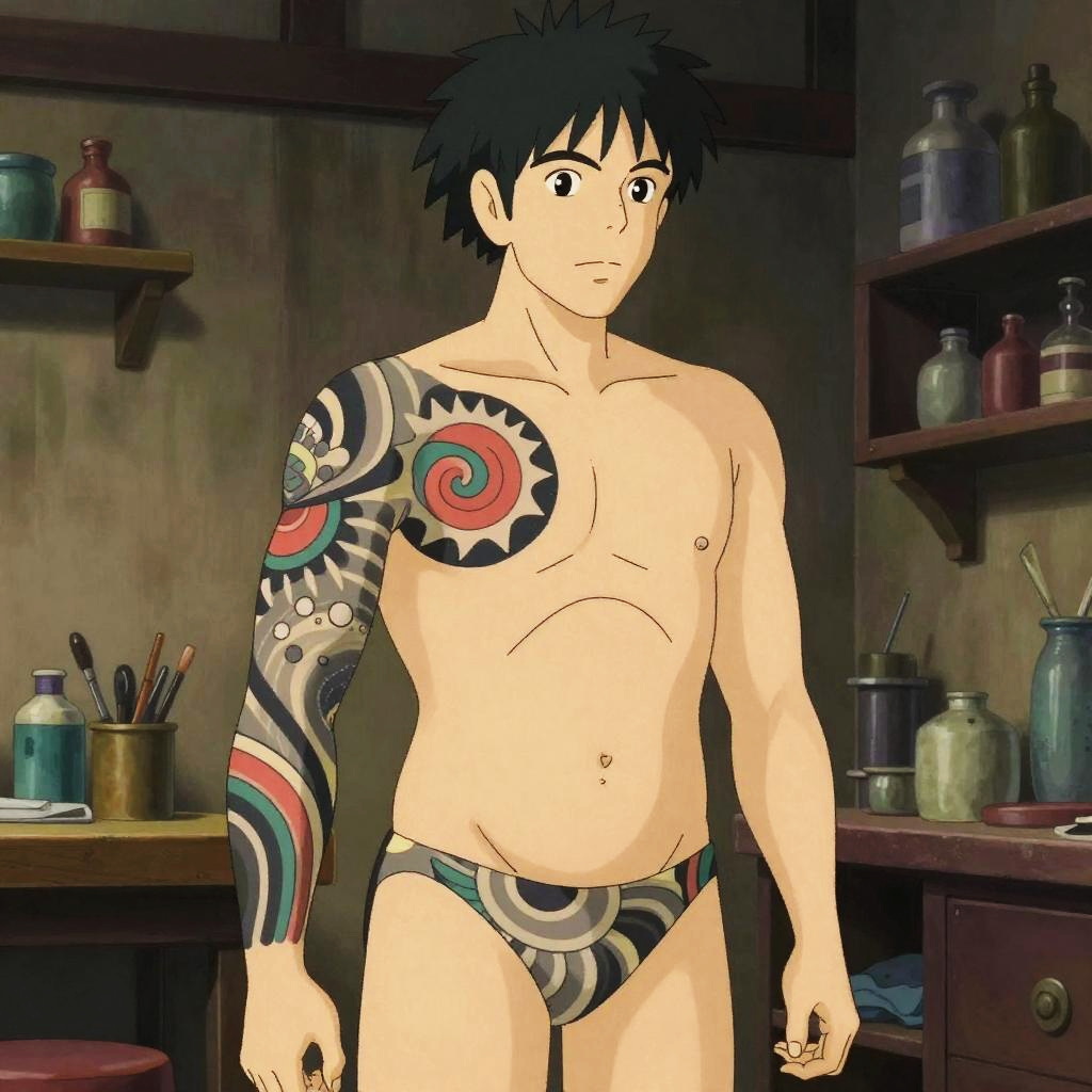 Tattoo, irezumi, (facing viewer:1.2), full body, looking away, Style-Lab, (inside workshop:1.2), Vector art, Vivid colors, Clean lines, Sharp edges, Minimalist, Precise geometry, Simplistic, Smooth curves, Bold outlines, Crisp shapes, Flat colors, Illustration art piece, High contrast shadows, Technical illustration, Graphic design, Vector graphics, High contrast, Precision artwork, Linear compositions, Scalable artwork, Digital art, (Studio ghibli style, Art by Hayao Miyazaki:1.2), Anime Style, Manga Style, Hand drawn, cinematic sensual, Sharp focus, humorous illustration, big depth of field, Masterpiece, concept art, trending on artstation, Simplified style, trending on ArtStation, trending on CGSociety, Intricate, Vibrant colors, Soft Shading, Simplistic Features, Sharp Angles, Playful