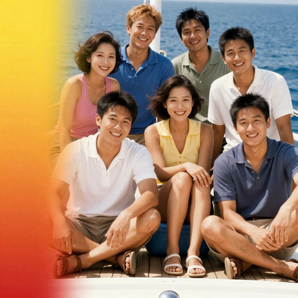 Photograph of a movie poster showing a group of six people in a boat, smiling. Five men and one woman, standing and sitting, with blue ocean background. Yellow and red color gradient on the left. Boat's deck visible. Bright, cheerful expressions.