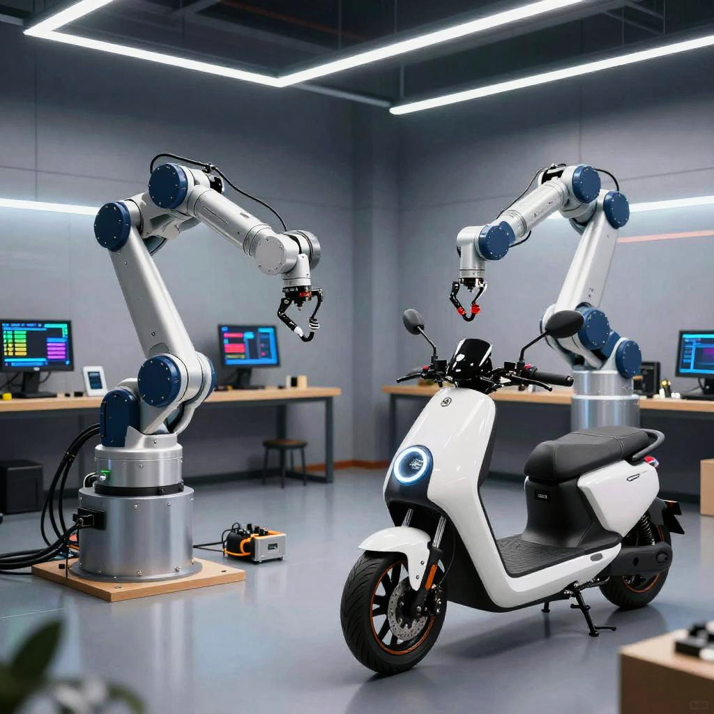Robotic arms and AI-driven tools in an ultra-modern garage setting, repairing and upgrading electric motorcycles, digital control panels with colorful data streams, sleek metallic textures and dynamic lighting creating a sci-fi workshop ambiance