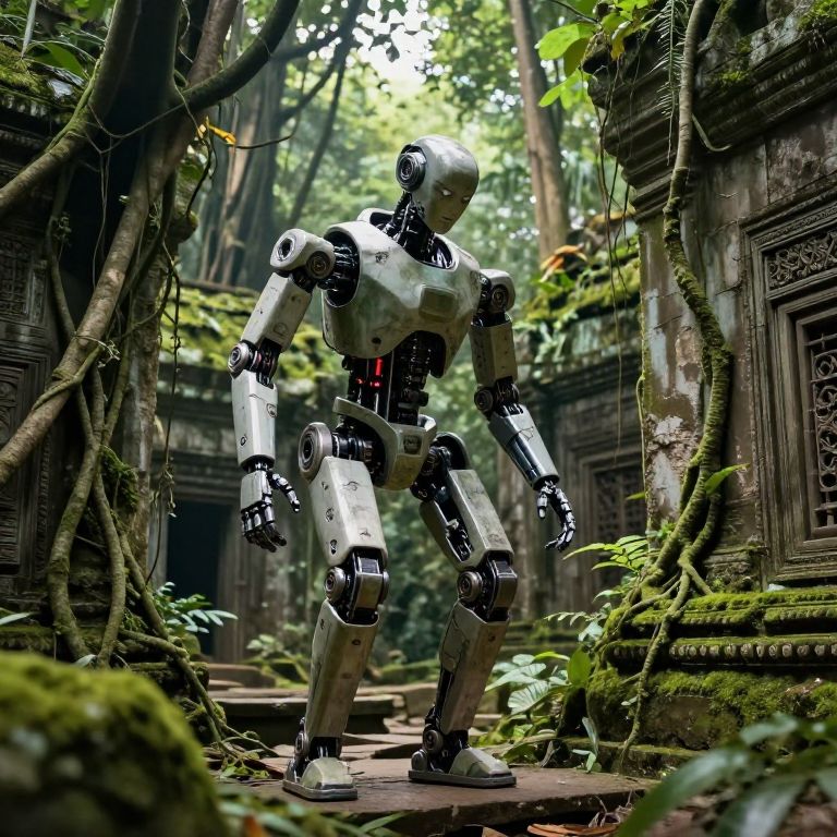 Photograph of a silver humanoid robot standing amidst ancient, moss-covered stone ruins in a dense, jungle-like forest, with sunlight filtering through the trees.