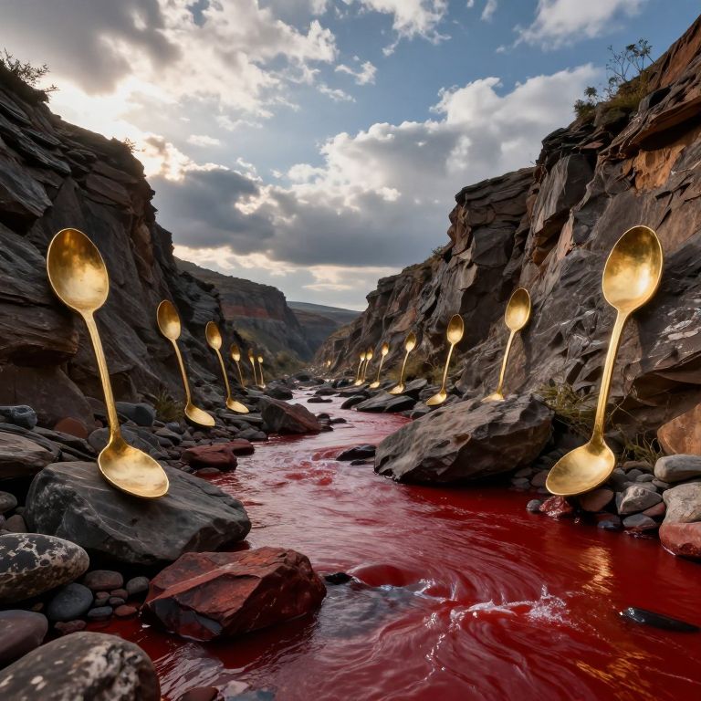 Photograph of surreal landscape: golden spoons embedded in rocky canyon, flowing red water under dramatic cloudy sky, creating an otherworldly effect.