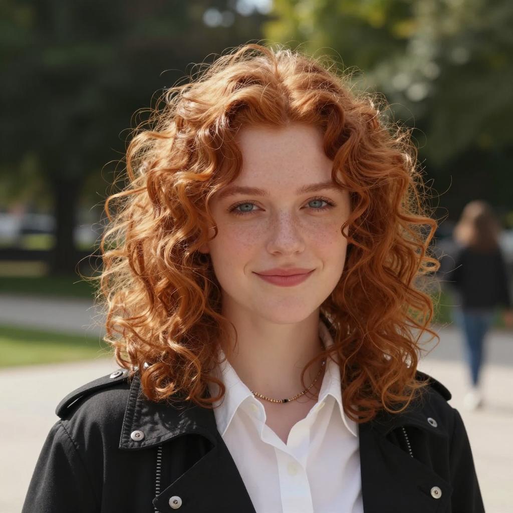 Portrait of a teenage girl with curly red hair and light freckles, wearing a vintage grey cable-knit sweater and a dark pleated skirt. She is sitting on a wooden chair against a dark background, showing a bright smile and clear expressive eyes. The image features high dynamic range with vivid colors, rich details, and strong contrast, emphasizing the texture of her clothing and the shine of her hair.