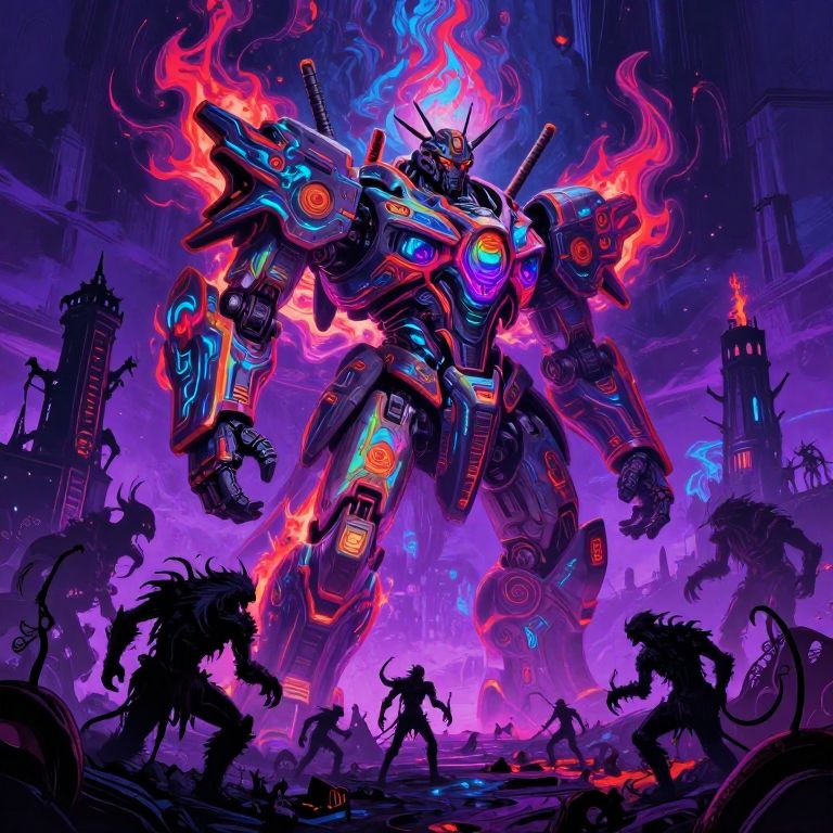 Digital artwork depicting a colossal, glowing robotic warrior with neon blue, red, and purple accents, standing amidst a dark, purple-hued, gothic cityscape. The robot's armor is intricately detailed, with fiery, ethereal flames emanating from its shoulders and head. Silhouetted, demonic-like creatures with horns and tails battle in the foreground. Tall, dark towers with glowing red eyes and intricate designs frame the background. The scene is dynamic and vivid, with intense colors and a surreal, otherworldly atmosphere. The style is reminiscent of high-energy, fantasy sci-fi art.
