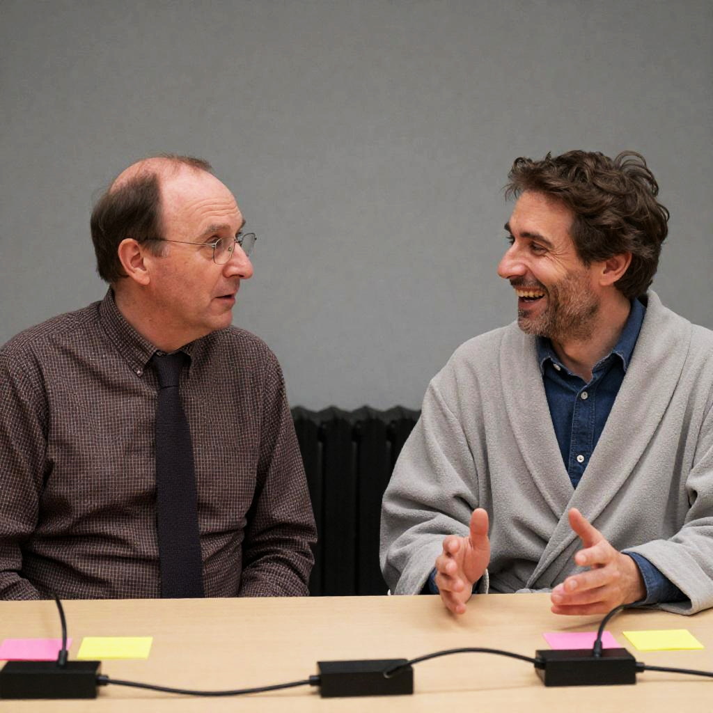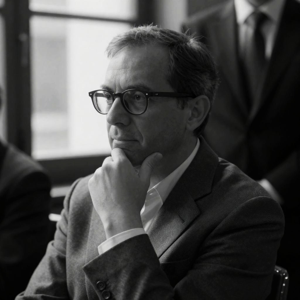 Photograph of a man with medium-length brown hair, wearing glasses and a green button-up shirt with chest pockets, sitting at a table. He holds a pen in his right hand and a white cup in his left. Background has a ured, light-colored wall and a patterned wooden panel. A glass is on the table in front of him.
