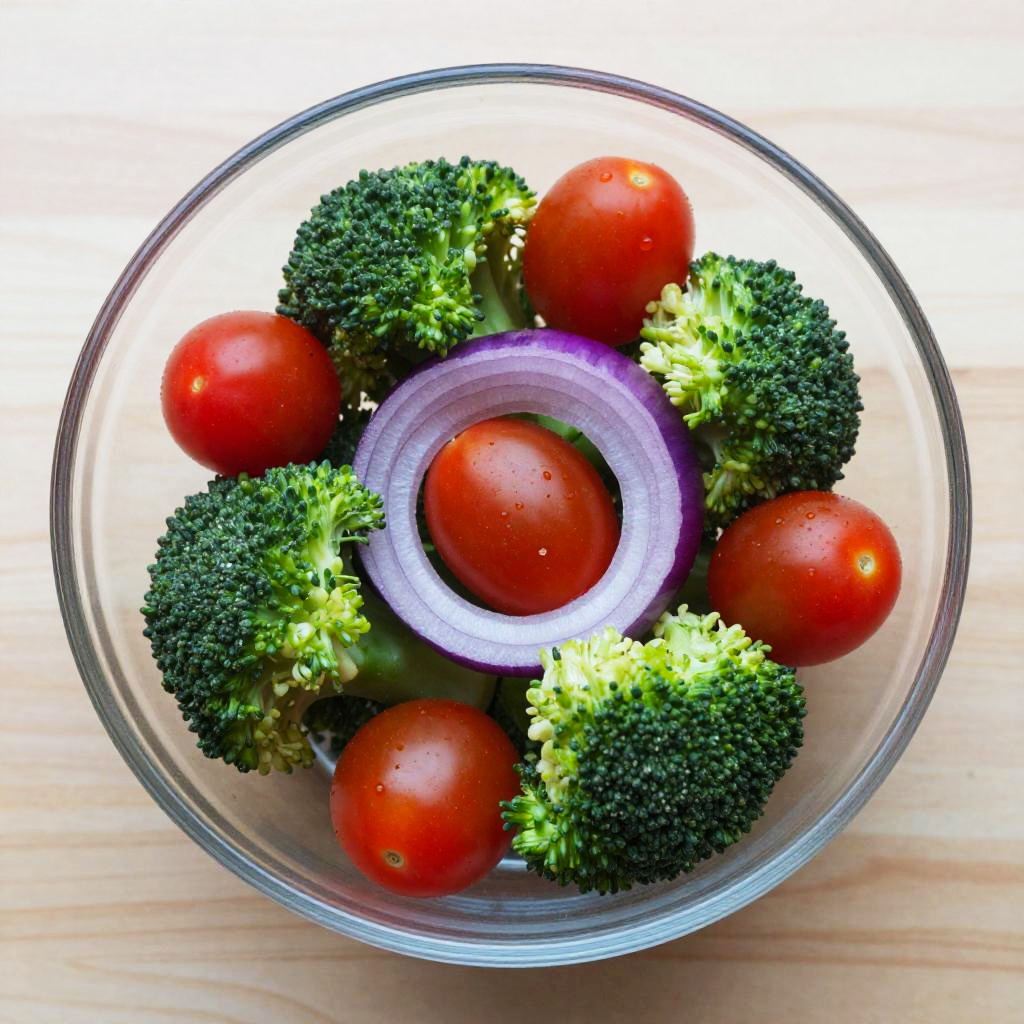 Photograph of a clear glass bowl filled with vibrant, fresh vegetables. The bowl contains seven bright red cherry tomatoes and seven broccoli florets with green stems. A single, thin purple onion ring is centered at the bottom of the bowl. The vegetables are arranged in a circular pattern, with the broccoli heads surrounding the cherry tomatoes. The bowl is placed on a light wooden surface, providing a neutral background that contrasts with the vivid colors of the vegetables. The image is taken from a top-down perspective, showcasing the symmetry and colorful arrangement.